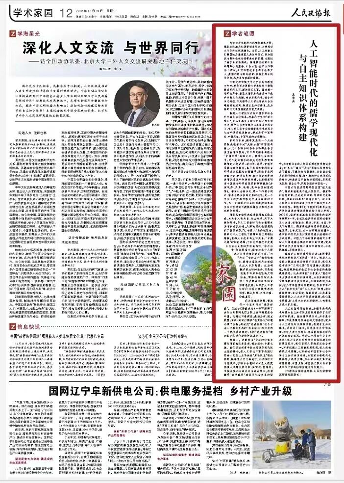 人工智能时代的到来,为儒学的现代化转型与自主知识体系的构建提供了前所未有的机遇。推动儒学现代化,并非复古怀旧,而是要激活其内在的文明基因,使其与人工智能时代同频共振;构建自主知识体系,并非闭门造车,而是要立足中国实践、吸收人类文明精华,形成能够解决时代问题的理论成果。党的二十届四中全会为未来5年乃至更长时期的文化强国建设作出顶层设计,我们要深入贯彻落实全会精神,牢牢把握人工智能发展机遇,深入挖掘传统文化精髓,扎实推进中国哲学社会科学自主知识体系构建,为国家治理现代化提供强大思想支撑,为全球治理变革贡献中国智慧、中国方案,在世界文明对话中彰显中华文明的独特价值与时代魅力。