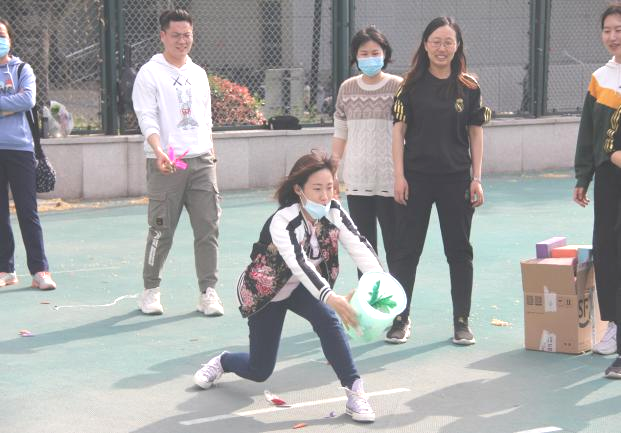 第一个项目“踩气球”将整个运动场上的氛围瞬间点燃。在激烈的争夺中,老师们既要瞄准对手的气球,又要保护自己的气球,场面一度非常热闹。“明枪易躲,暗箭难防”,随着圈子的不断缩小,“幸存”的人数也不断减少。热烈的“争斗”后,李琳老师笑到最后,获得一等奖。