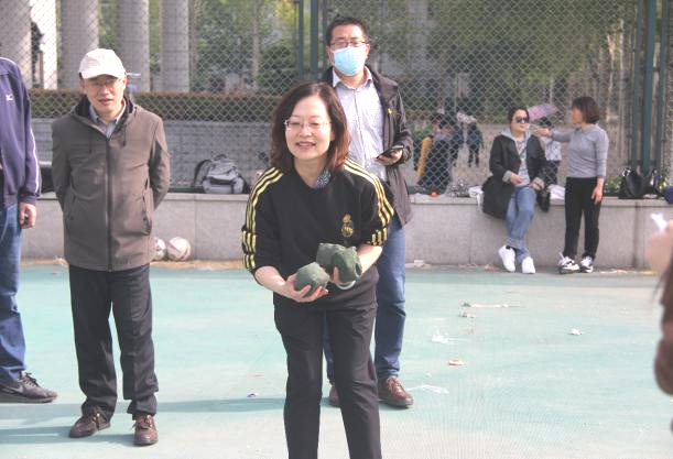 跳绳是相对轻松欢快的环节,女老师们英姿勃发,在项目中表现亮眼。“足球射门”“沙包投准”“套圈”和“飞镖投准”考察精准度和判断力,激烈程度有所降低,难度却丝毫未减。王承略老师一次精准的套圈命中,引得大家纷纷拍手叫好。“摸石头过河”则需要胆大心细,沉着稳定,比拼的是速度,更是心态——一旦从“石头”上掉下便前功尽弃。与第一个集体项目的激烈比拼不同,最后的集体项目“曲回运球”充满默契的配合:圆滚滚的网球在羽毛球拍上晃晃悠悠,球在传递,欢乐也感染了所有人。