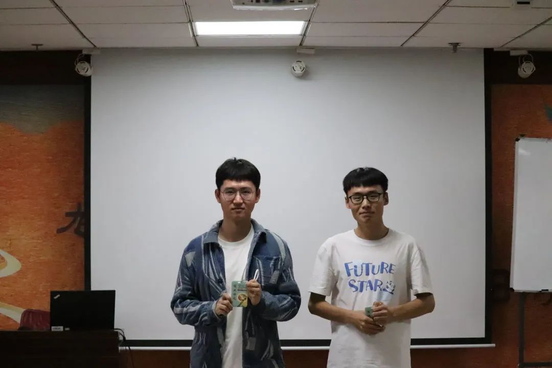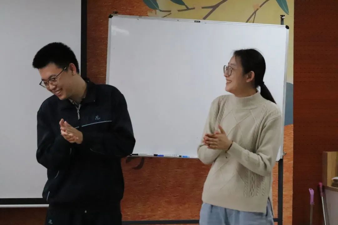 团建席位及游戏搭档都以抽签的方式决定,参与者通过抽签,组成搭档,共同进入第一场游戏——“你划我猜”,比划的同学肢体与语言并用,使出浑身解数传递信息,猜词的同学时而苦苦思索,时而灵光乍现,双方在一次次配合中,逐渐产生了默契,穿插在游戏中的自我介绍也让彼此之间更加了解。
