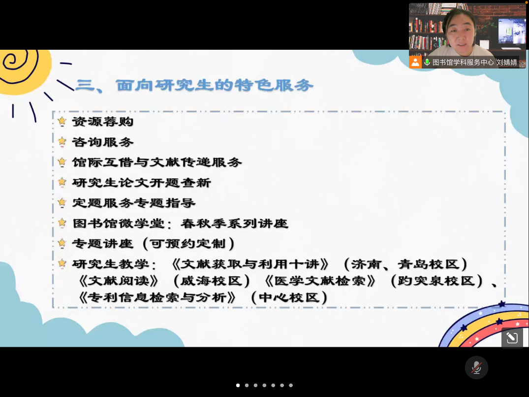 通过腾讯会议开展了“图书馆资源使用培训”的主题报告会。本次讲座由山东大学图书馆学科馆员刘婧婧主讲,2022级全体新生参加了此次会议。
