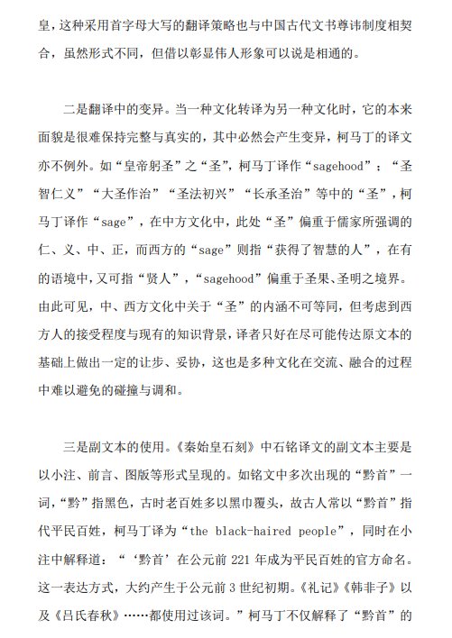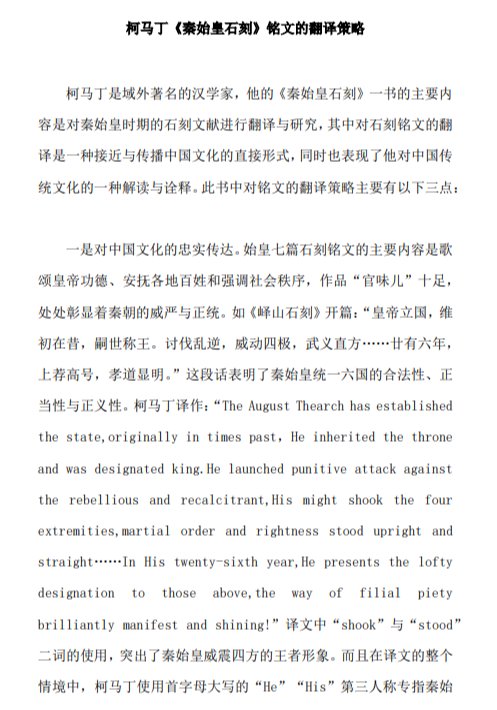 通过始皇石刻铭文与相应译文的对比,可以发现柯马丁在对中国传统文化的翻译过程中采取了灵活的翻译策略,无论是词语与句式的选择,还是采取字母大写、文化补偿等形式,都尽量使译文与原文在形式上、内容上和含义上相贴近。当然,由于中西文化属性的差异,译文与原文之间发生变异是不可避免的,我们读者应当理性看待。