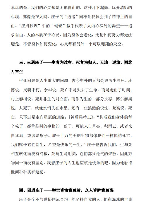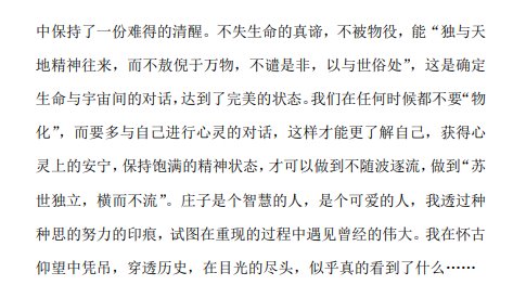 庄子是个智慧的人,是个可爱的人,我透过种种思的努力的印痕,试图在重现的过程中遇见曾经的伟大。我在怀古仰望中凭吊,穿透历史,在目光的尽头,似乎真的看到了什么……