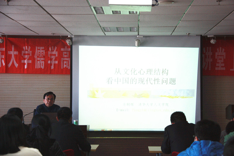 方朝晖教授作了题为“从文化心理结构看中国的现代性问题”的报告。方教授从更深远的背景中看待中国的传统文化,并提出处于儒家传统文化背景下的我们,能在多大程度上准确理解传统文化的提问。他认为中国文化有三个预设,分别是此岸取向、关系本位和团体主义。方教授通过对伊斯兰教、印度教与中国文化的比较,分析了中国与西方对生命的不同理解。西方的宗教,预设了原罪的生命。他们认为,他们生前所生活的世界只是人生中的一小部分,灵魂摆脱掉肉体是极为重要的目标,因而更加向往永恒的灵魂。而中国人则相信看到的世界是真实的而不是虚幻的,身与心是同样重要的,希望能够合一,所以十分注重身心,格外珍爱生命,注重养生。通过对东西方思维方式的心理学分析,方教授提出,西方人认为每个整体都由独立的个体组成,西方文化是个体本位。但中国文化却是一种关系本位,中国人所做的决定受到人际关系影响的程度高于西方。中国人将安全感寄托于自己与他人的关系中,看自己能否处理好与他人的关系。这种把个人和团体的关系当做屏障,人在团体的掩护中才有安全感现象,被方朝晖教授称为团体主义。并由此产生了中国社会中“重人情、轻制度”,“重私德、轻公德”等现象。最后,他提出了我们应该“跳出中国看中国,跳出儒家看儒家”的建议。