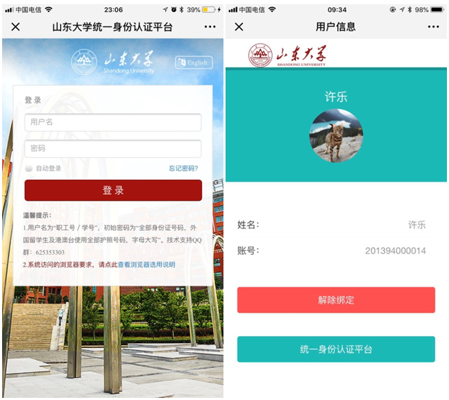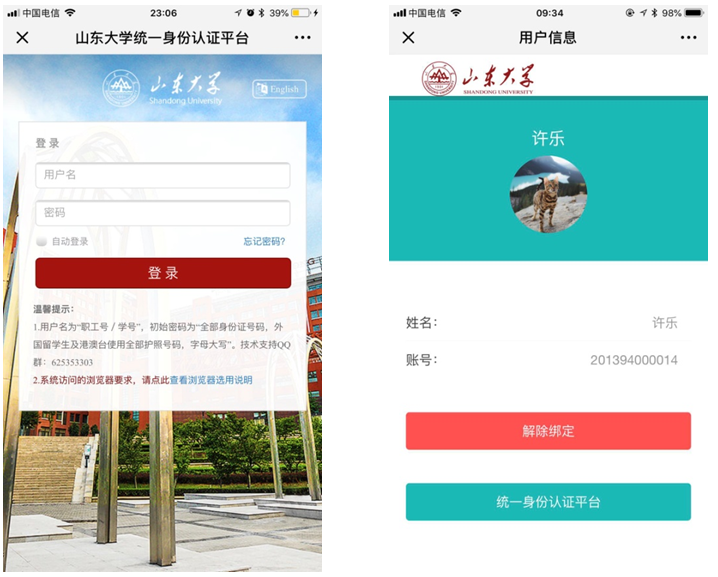 注:山东大学微信企业号只面向校内师生医务员工开放,首次使用需要先通过山东大学统一身份认证进行绑定操作。校内师生绑定身份成功后,才能在微信企业号中获得相关服务。