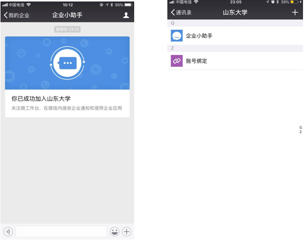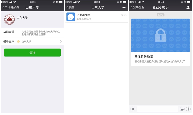 2.方法二:在微信中关注“山东大学微信企业号”,等待管理员审核批准后再绑定统一身份认证。