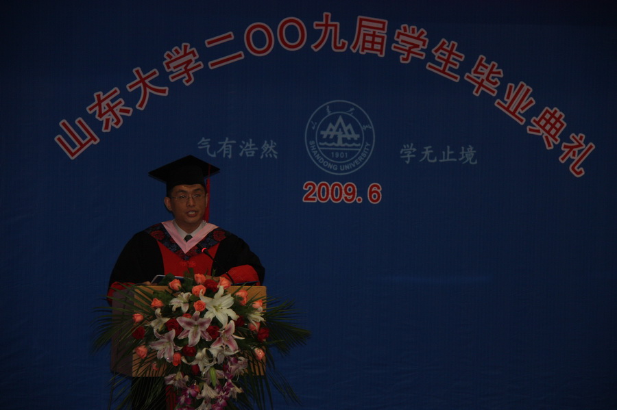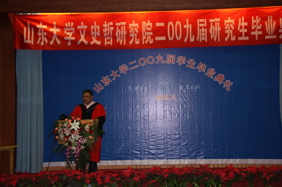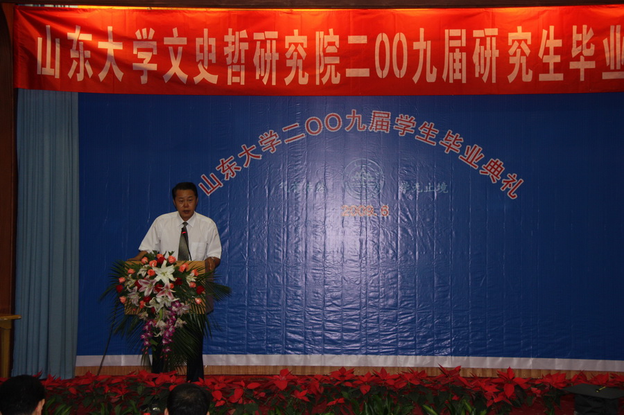 6月25日,文史哲研究院2009届研究生毕业典礼在中心校区邵馆报告厅举行。有关研究所负责人、教师代表、校友代表、毕业生家长代表、全体毕业生、在校生代表近300人参加了毕业典礼。