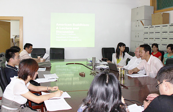 霍夫曼教授本次学术讲座以美国佛教为主题,在演讲过程中主要从人与人之间的关系、生态伦理、作为随意而非绝对永恒的生命形式入手,介绍美国佛教的研究发展现状以及发展趋势和佛教研究中的主要知识,拓宽了学生的研究视野,为中国传统文化研究提供了新知识新视角。霍夫曼教授精彩诙谐的演讲博得了学生们的阵阵掌声和会心笑声。讲座现场气氛热烈,全程使用英语的互动式讨论方式,给在场人员留下了深刻印象。