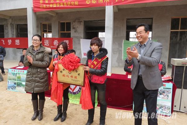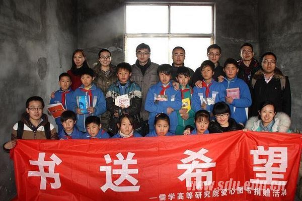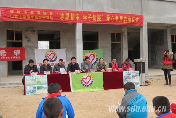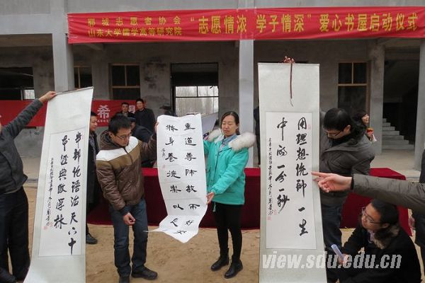 在郭庄村,开心的村民在村口扭起了幸福的秧歌,等候大家的到来,热烈的秧歌驱散了冬日的寒意。山大学子代表和郓城志愿者在郭庄学前班大院举行了隆重的捐书仪式。仪式由省文化厅下派该村的“第一书记”王炳春主持,王敏、吕晓钰、郓城志愿者协会会长吕斌、郭庄村党支部书记高现昌依次发言,并走进孩子们中间,亲自将图书送到孩子们手中。紧接着,山大学子代表还现场献上了精彩的娱乐节目,杨茹独唱的《谁不说俺家乡好》和学子合唱《让我们荡起双桨》给大家留下了深刻的印象,研究生代表范作升现场挥毫,表演书法。