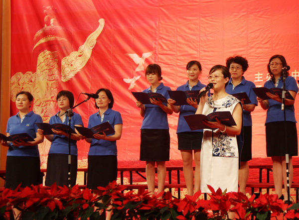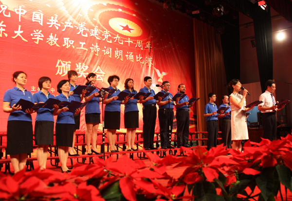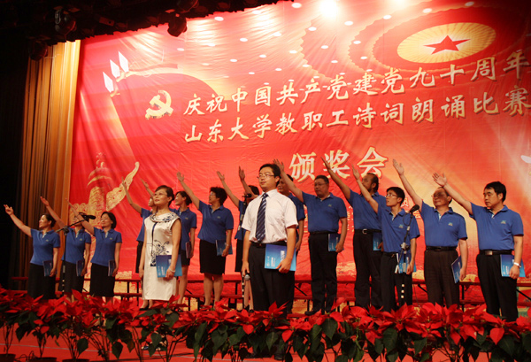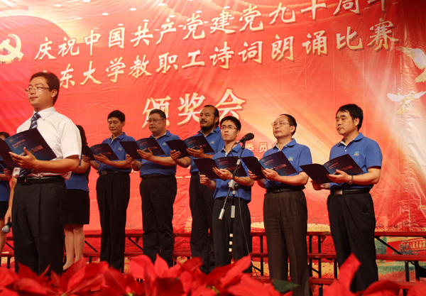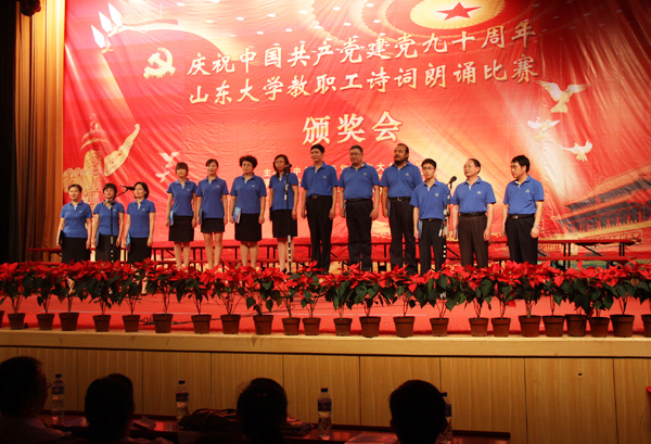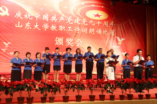 6月28日下午在科学会堂,山东大学召开“庆祝建党九十周年教职工诗词朗诵比赛颁奖大会”。我院受邀作为全校人文社会科学所有相关单位唯一代表队,参加汇报演出。