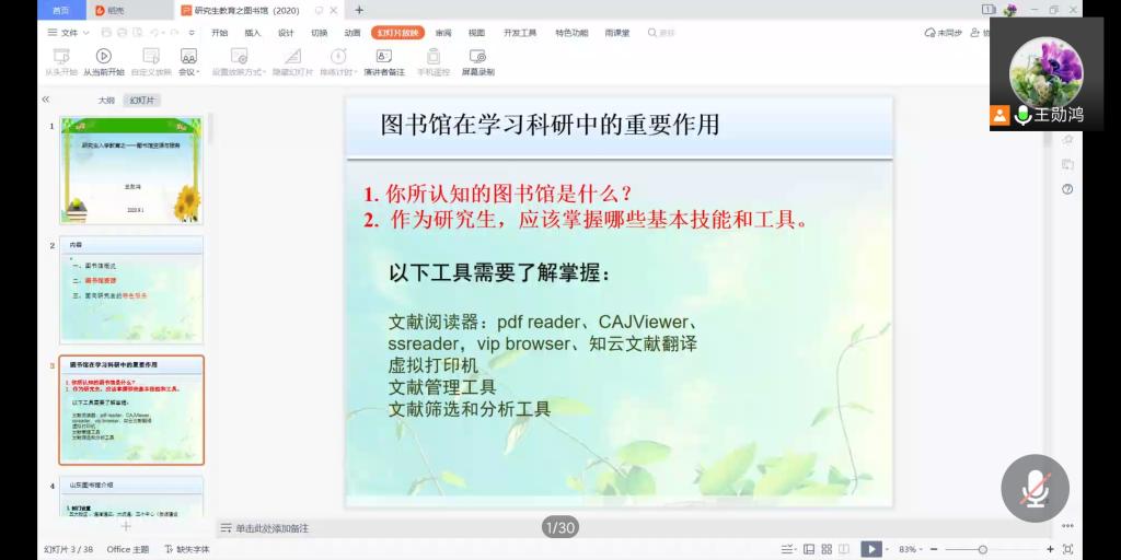 2020级新生在腾讯会议室接受了图书馆资源与服务培训。本次培训以向新生讲解图书馆资源和文献检索技巧为目的,邀请山东大学图书馆研究馆员王勋鸿老师主讲。