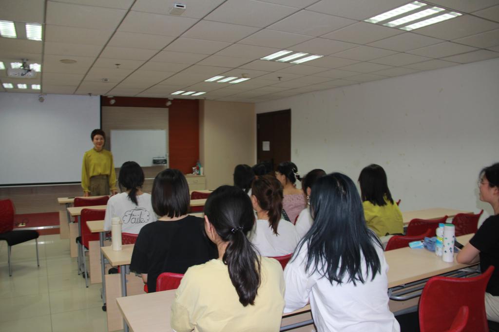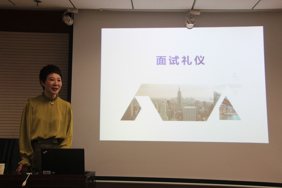 韩英副教授于知新楼A2116为同学们讲解面试礼仪。讲座中,韩英老师从简历制作、仪表修饰、对话交谈三个方面为同学们讲解了面试礼仪。
