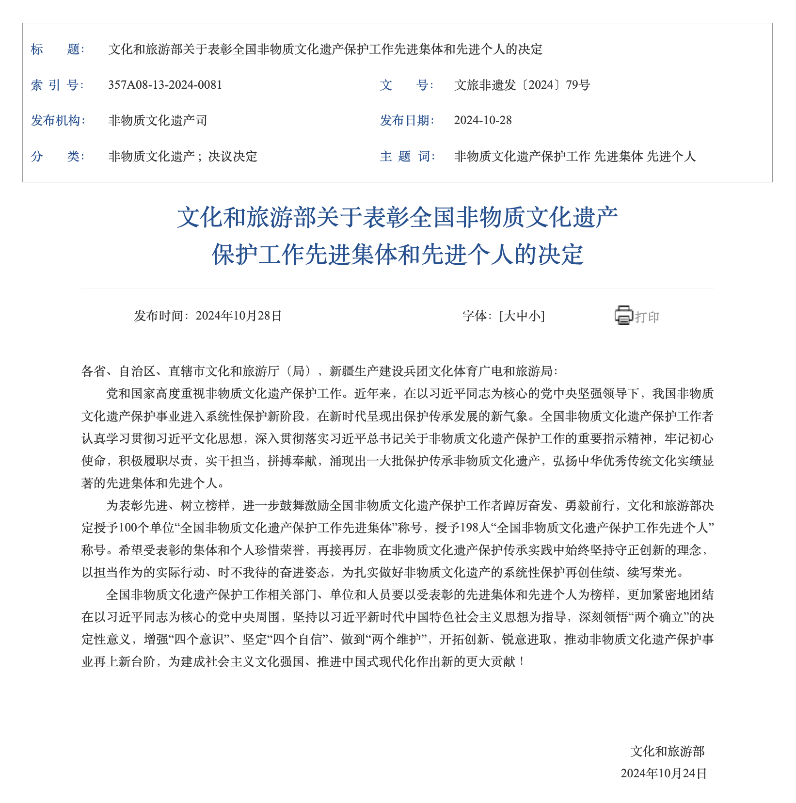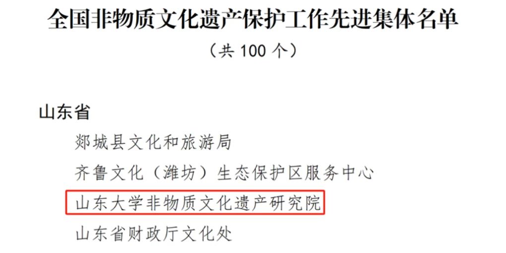 2024年10月28日,文化和旅游部发布《文化和旅游部关于表彰全国非物质文化遗产保护工作先进集体和先进个人的决定》。山东大学非物质文化遗产研究院被授予“全国非物质文化遗产保护工作先进集体”称号。