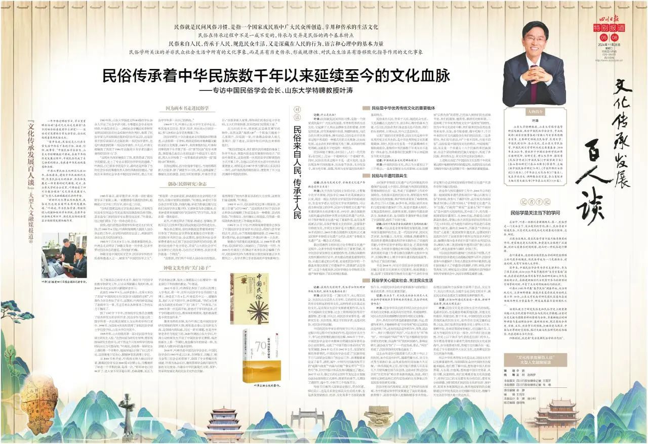 叶涛从事民俗文化研究已近40年,在他看来,建设中华民族现代文明,优秀民俗文化的保护、传承和发展是一项重要的时代课题。近日,在山东大学的办公室里,叶涛接受了四川日报全媒体“文化传承发展百人谈”大型人文融媒报道记者的专访。“新时代文化事业生机盎然,民俗文化也迎来前所未有的发展机遇。”叶涛说,作为民俗学者,将继续深入挖掘和继承学术传统,在提升全社会的文明水平、满足民众的社会需求方面继续发挥积极作用。