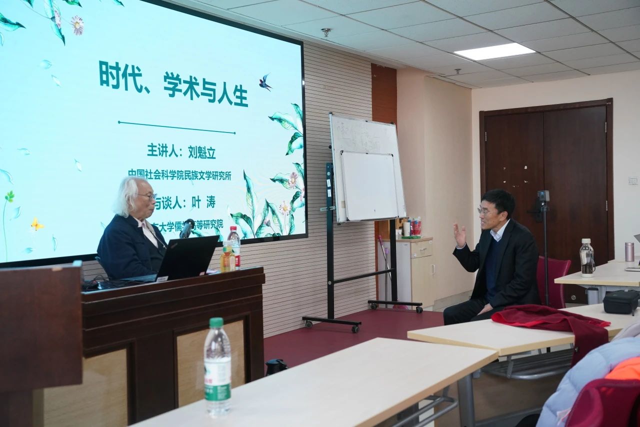 叶涛教授在与谈过程中指出,刘教授关于“从民俗、民间文学到非物质文化遗产,不是一个代替的关系,而是从理论到方法的深化拓展”的论断,给予我们深刻的触动与启发。以刘魁立教授为代表的一代学者积极投身非物质文化遗产保护运动,成为这场文化运动的中坚力量,这也是民俗学、民间文学学科参与者应当学习、思考的。叶涛教授希望通过本场讲座,同学们能更为深切地感受到前辈学人对学问的追求和对学术的传承,进一步理解时代、学术与人生的密切关联。叶涛教授还以照片分享的形式,展示了在刘魁立教授的组织和引导下,中国民俗学会四十余年来的壮大历程。