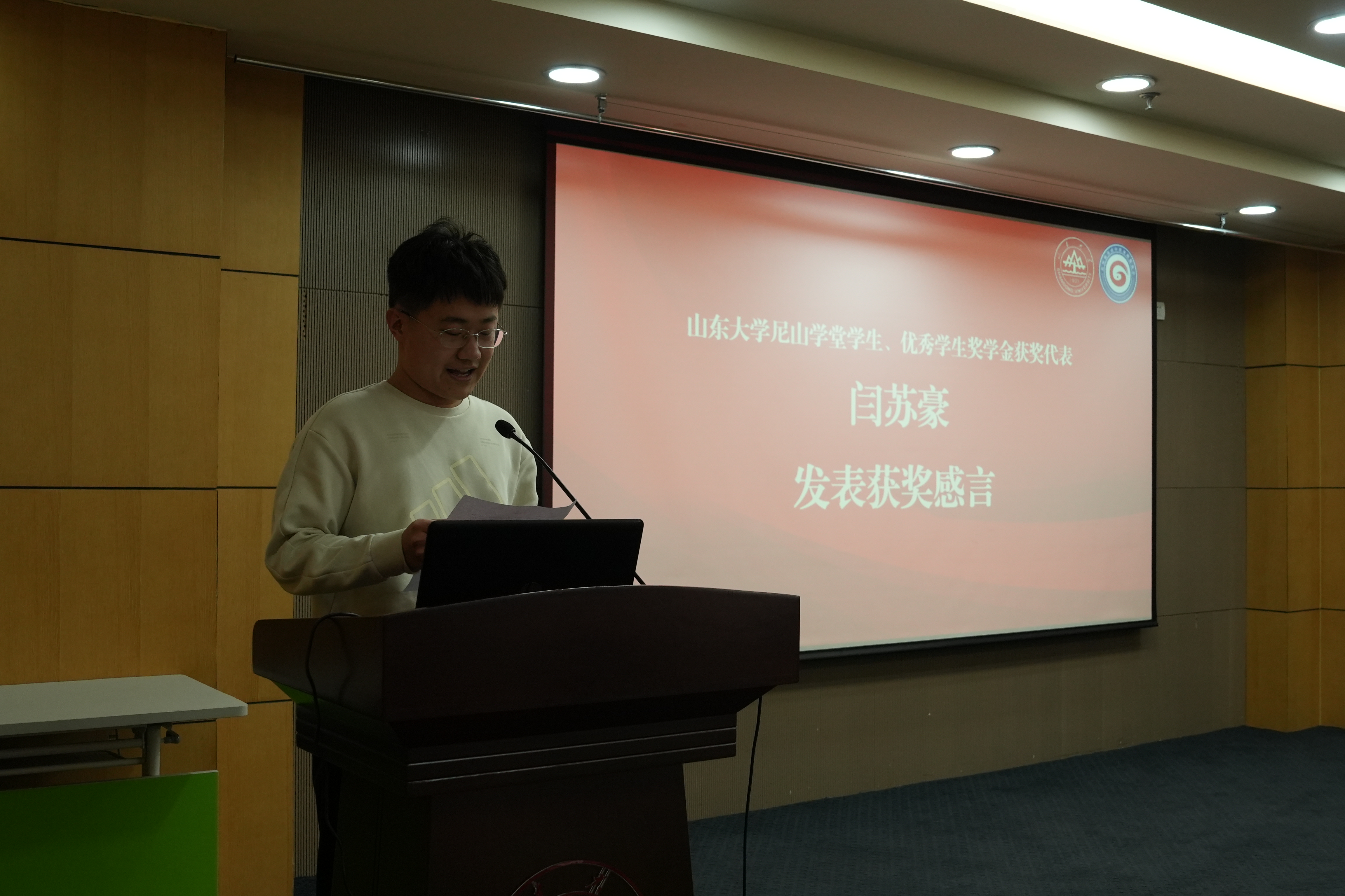 “优秀学生奖学金”获奖代表闫苏豪在获奖感言中提到,得益于尼山学堂开放包容的人文环境,其培养了较为广泛的学术视野与良好的学术品位,未来他也希望能够投入更多的时间去研究古典文献学,秉持弘扬文化、传承学术的初心,传阳秋于海内,全心史于井中。
