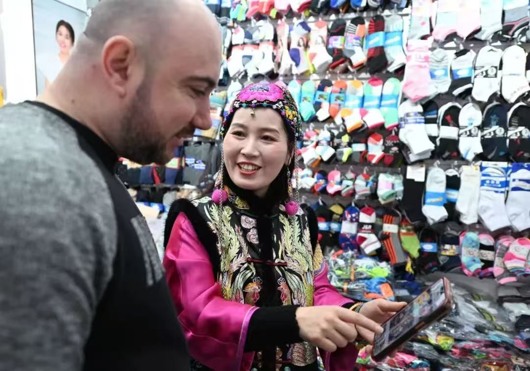 2025年2月25日,浙江义乌商户傅江燕向外籍客商介绍AI生成的海外带货视频。中新社记者 王刚 摄
