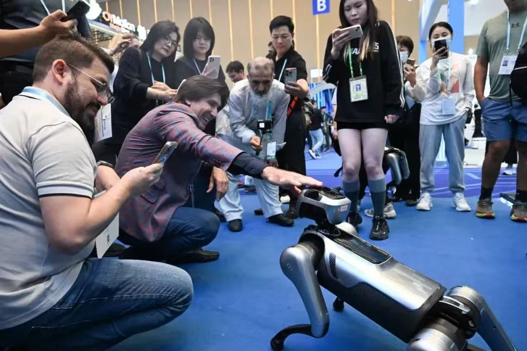 2025年4月18日,第137届广交会,境外采购商正在和机器狗互动。中新社记者 陈楚红 摄
