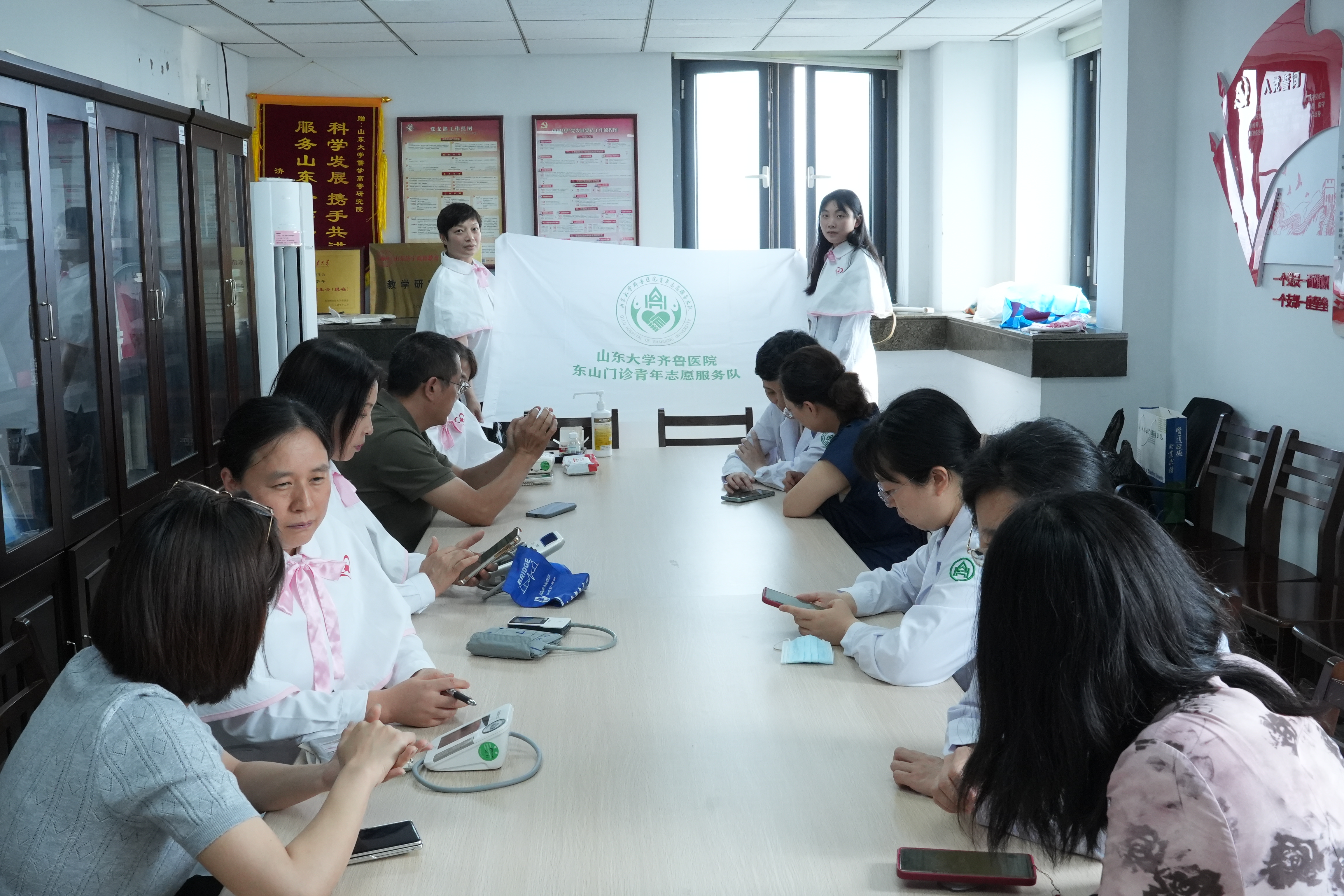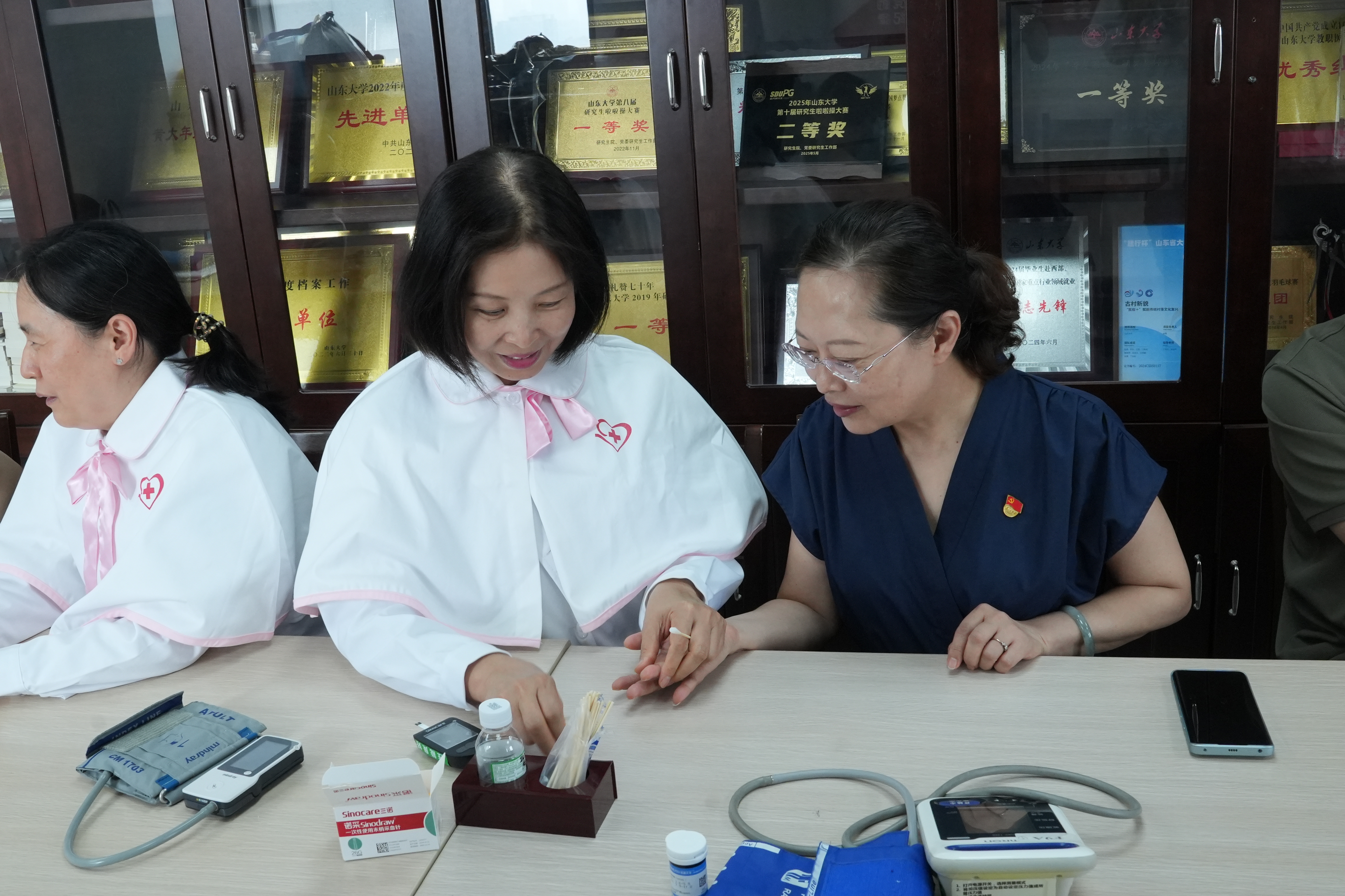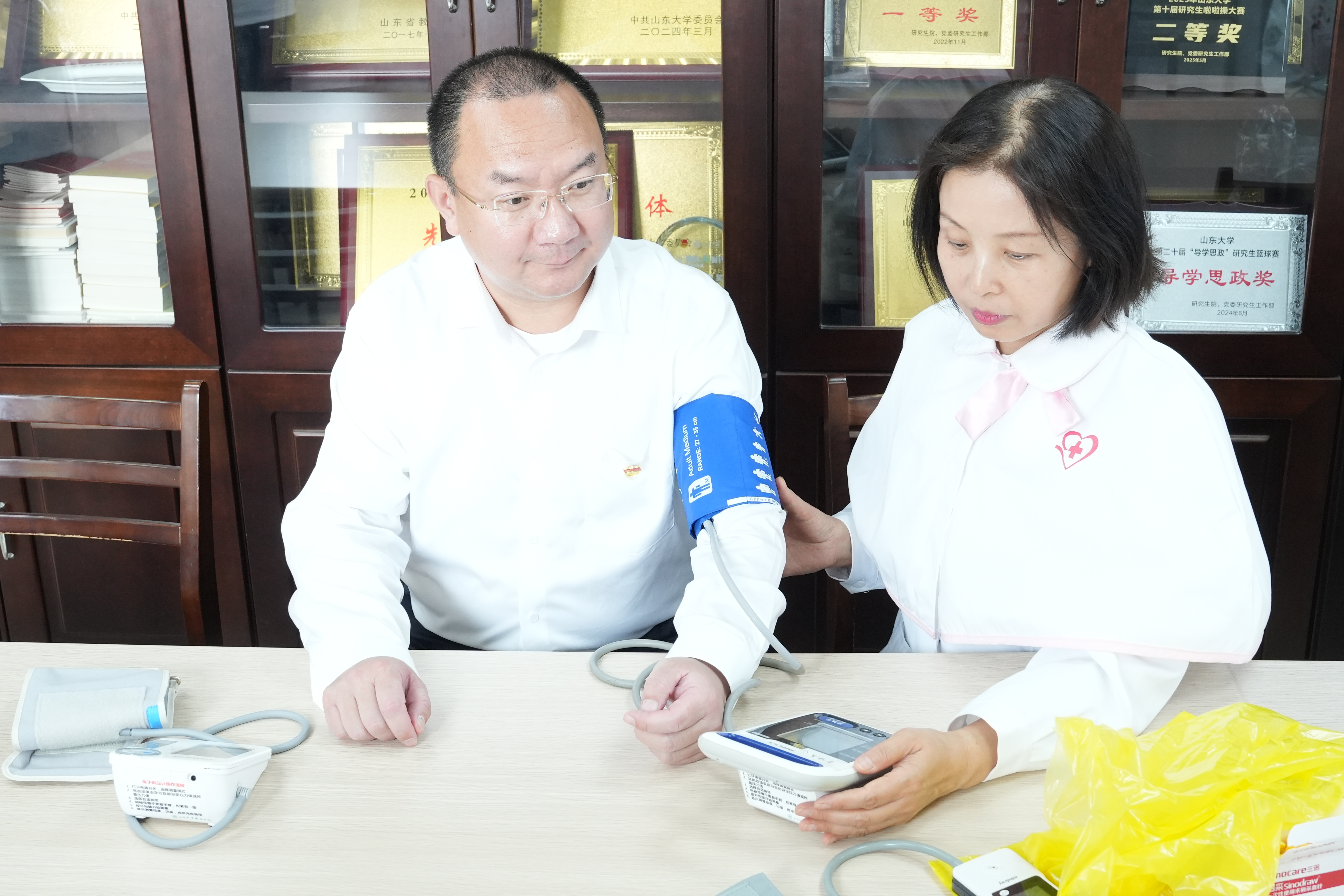 邢艳秋主任介绍了“优质诊疗进校园”服务计划,该计划通过义诊、讲座等为山大专家学者提供全周期健康保障。活动现场,齐鲁医院专家团队开展义诊与科普宣讲,针对常见慢性病、夏季养生等提供专业指导,校医院医护人员同步进行血压血糖检测、发放健康手册。