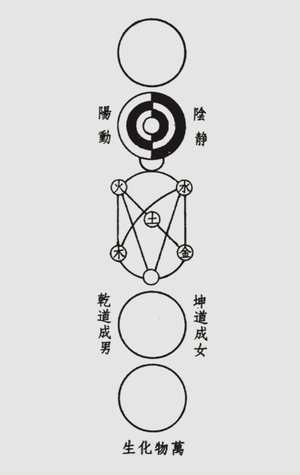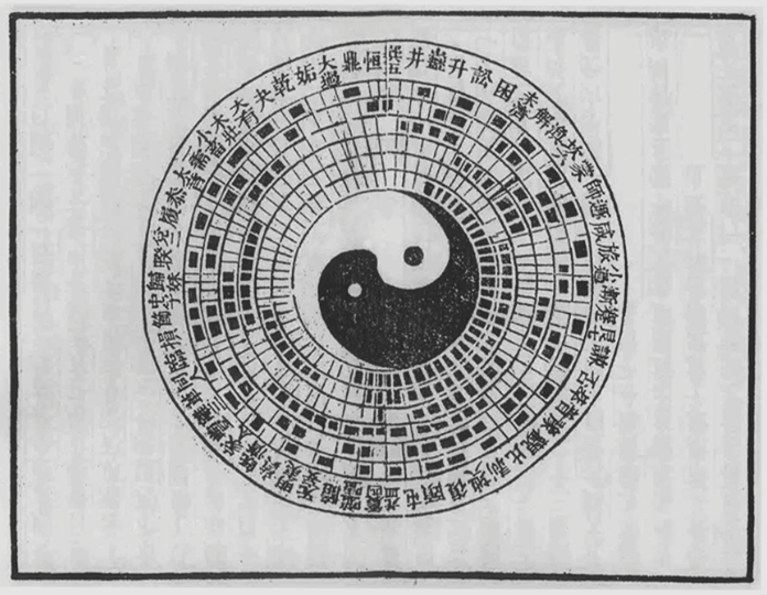 北宋周敦颐《太极图说》附载的“太极图”,是中国哲学史上首个以“太极”命名的图式,对宋明理学的易学与哲学建构影响深远(见图1)。该图式共分五层,其中第二层的“水火匡郭图”虽与当今流传的阴阳鱼太极图在“阴阳互动”的视觉呈现上有共性,且经诠释可体现阴阳中和的哲学内涵,但二者并无直接传承关系。周敦颐“太极图”并非直接解《易》,只是借易说理,表达“立人极”的伦理学理想,内容上可能广摄道释诸家,黄宗炎明言:“此图之非易,而且有老与仙与释之淆乱。”蔡清在解释“易有太极”章句时亦提出:“故此‘太极’字亦是易中之太极,与周子《太极图》者不同。”