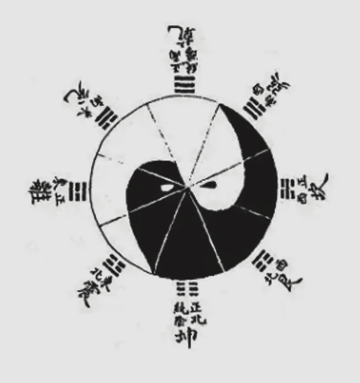 因此,我们所说的太极图并非周敦颐太极图,而是阴阳鱼太极图。阴阳鱼太极图的产生,正是为解释“一阴一阳之谓道”的易学思想,具体而言,是对《伏羲八卦方位图》(包括伏羲六十四卦方位图)的形象化解读,故太极图中间S曲线的弧度与伏羲八卦是严格对应的(见图2)。伏羲八卦方位又称先天八卦方位,由北宋邵雍提出。“《先天八卦方位图》是邵子易学哲学主张立场的鲜明代表和集中体现,邵子认为《先天八卦方位图》乃伏羲氏所创,是以四正卦为乾坤坎离的易图。”但在目前传世的邵雍著作中,尚未见到先天八卦的图式,仅能看到描述先天八卦的文字;南宋朱熹在其《周易本义》中,首次收录伏羲八卦次序图、伏羲八卦方位图、伏羲六十四卦次序图、伏羲六十四卦方位图,却未收录由先天方位图延伸而来的阴阳鱼太极图。