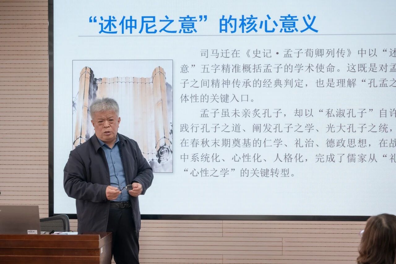 杨朝明教授强调,孟子对孔子思想的继承并非简单复述,而是“述而不作”中的创造性转化。孟子思想的核心本源始终是孔子,是对孔子“仁”学精神的深度继承与哲学升华。他指出,孔子虽提出“性相近也,习相远也”,但未系统阐释人性本质。孟子立足战国乱世,创造性地提出“性善论”,填补了这一理论空白,又提出“四端说”以证成仁义礼智为人性所固有。在修身工夫上,孟子以“知言养气”完善了孔子“诗礼相成”的外在规范。讲座中,杨教授特别考辨了《孔子家语》中的“五至”说,指出孔子关于“志气塞于天地”的论述正是孟子养气说的理论源头。从孔子到孟子,儒家气论完成了从外在规范到内在心性、从人间秩序到宇宙天地的理论升华。